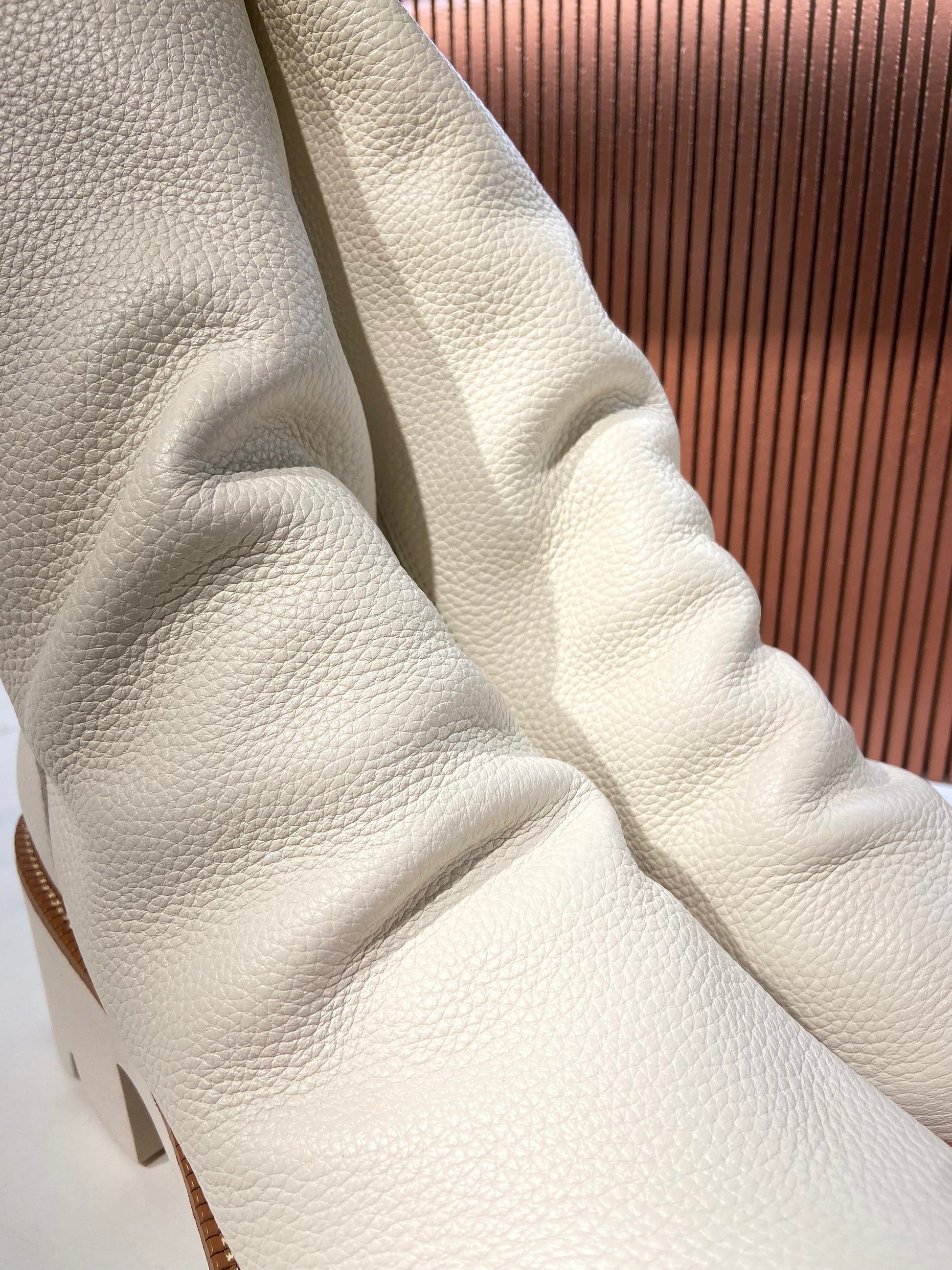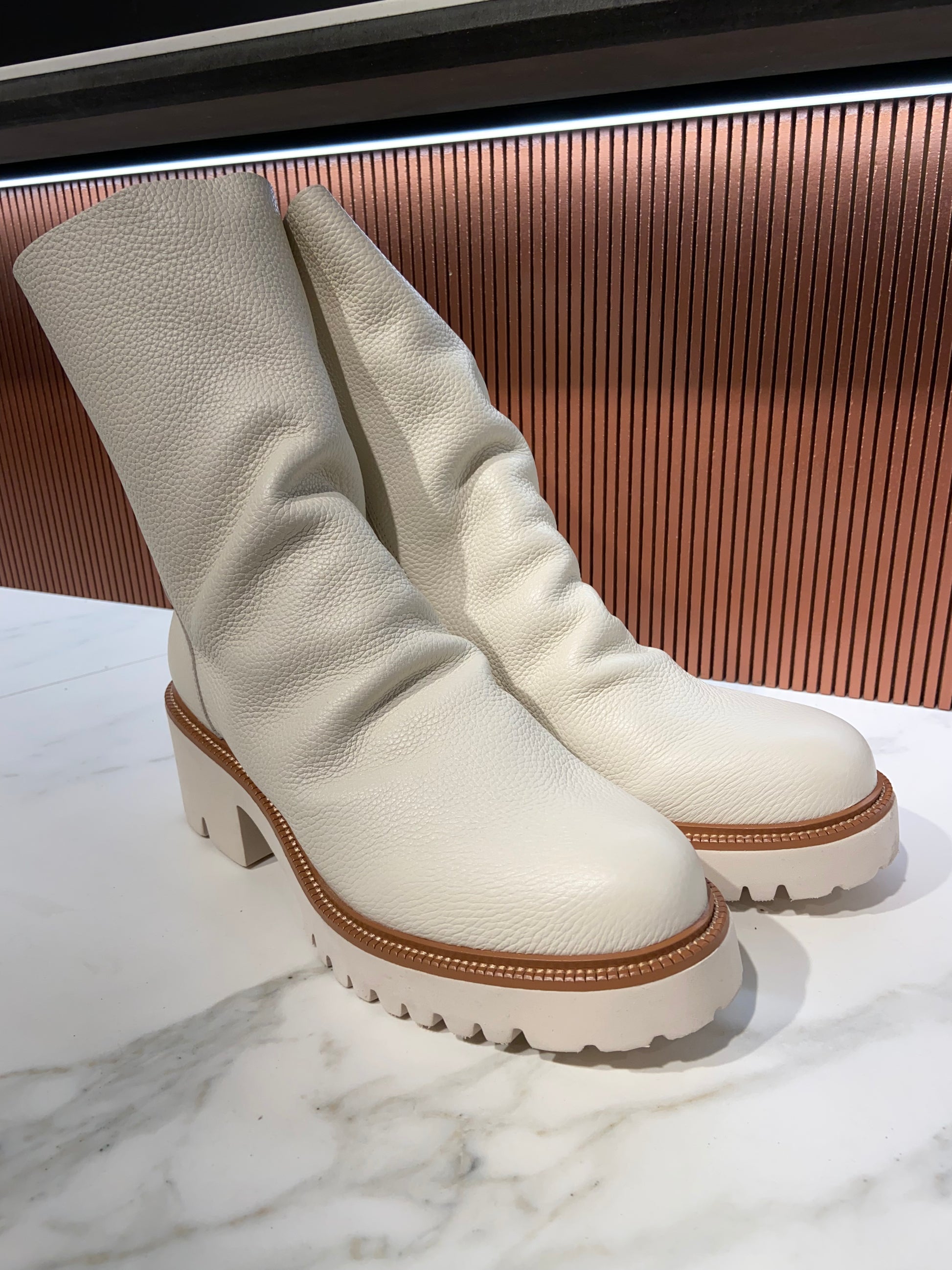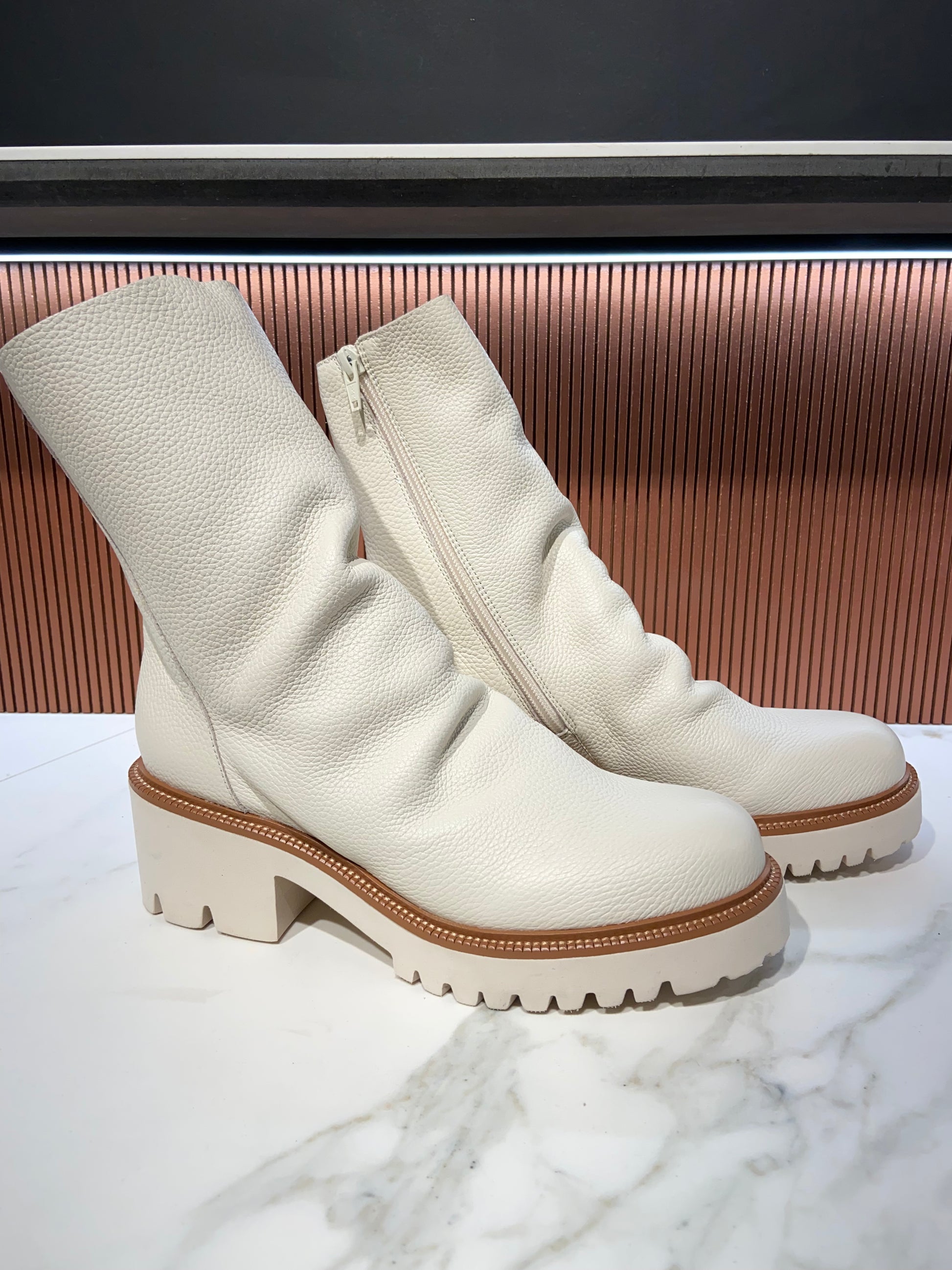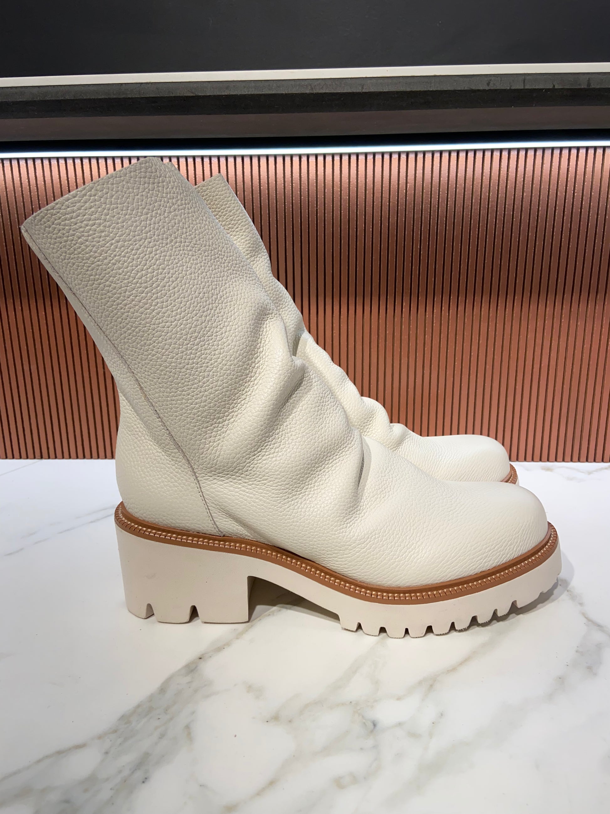 Bottines plissées en cuir blanc.