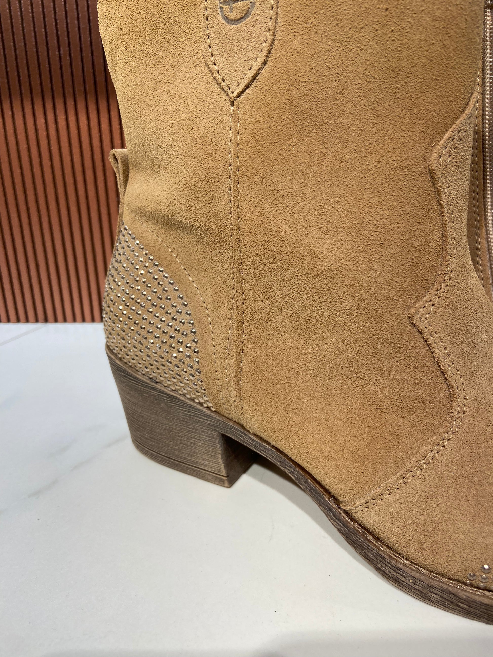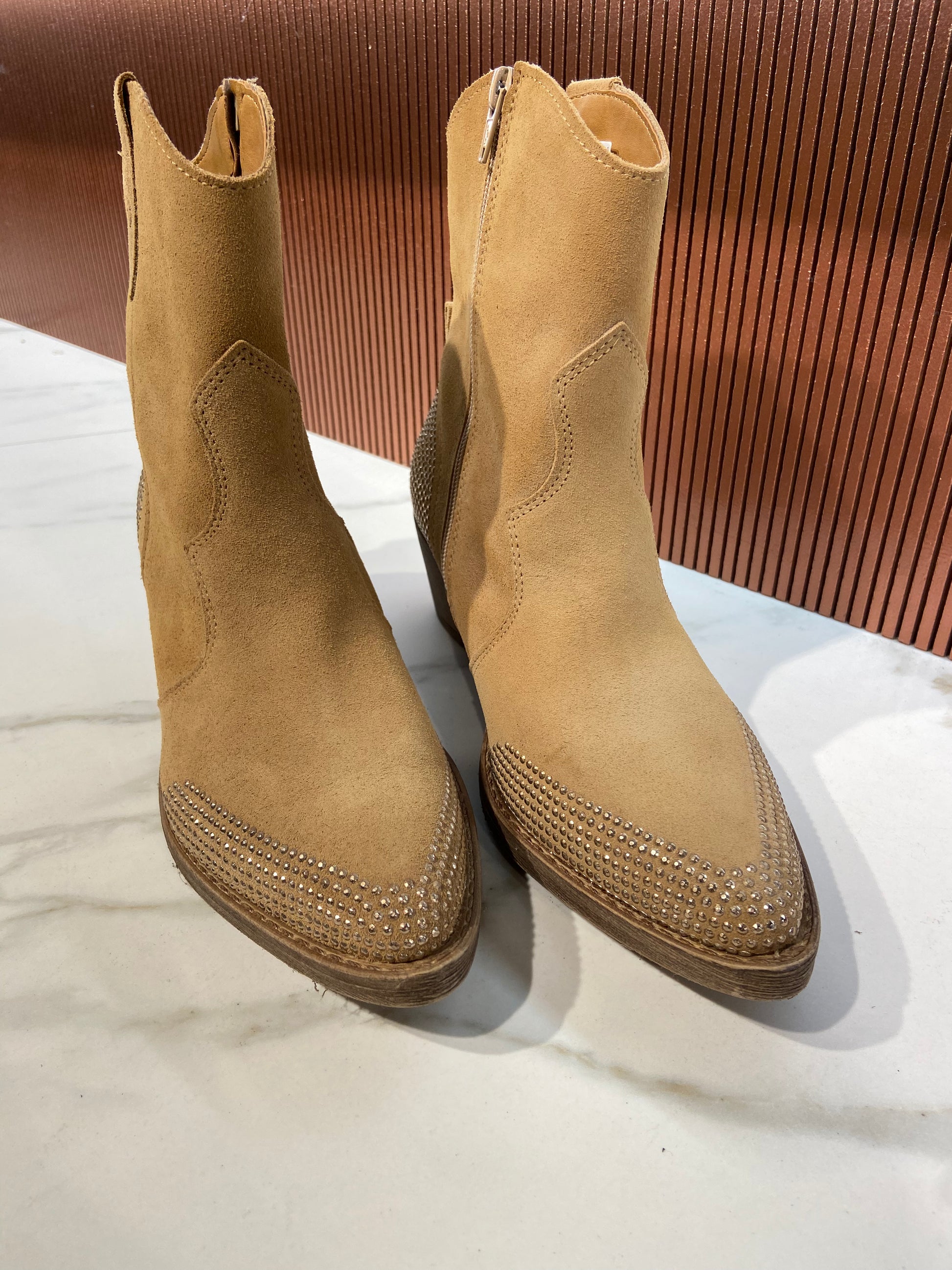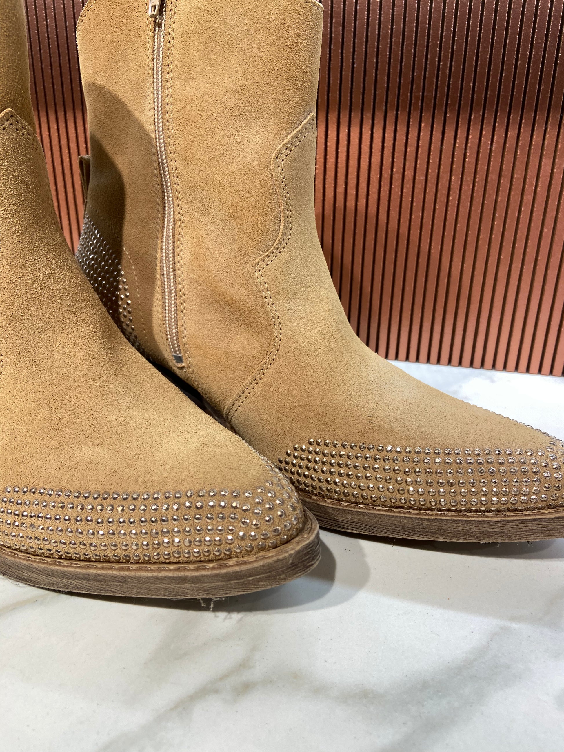 Bottines à strass type santiag en cuir beige.
