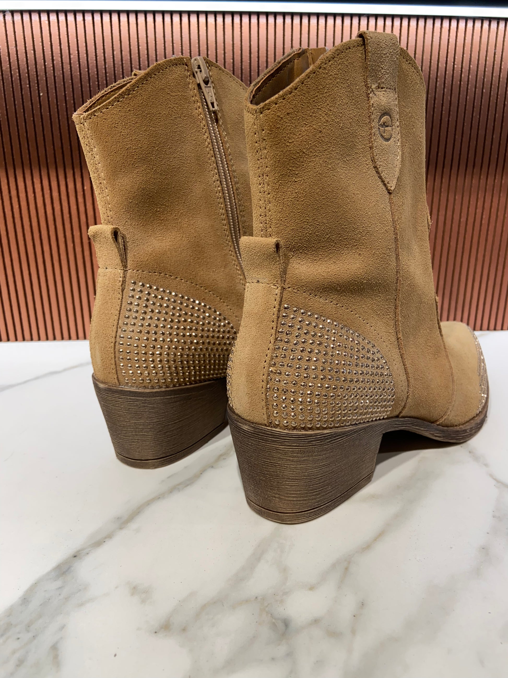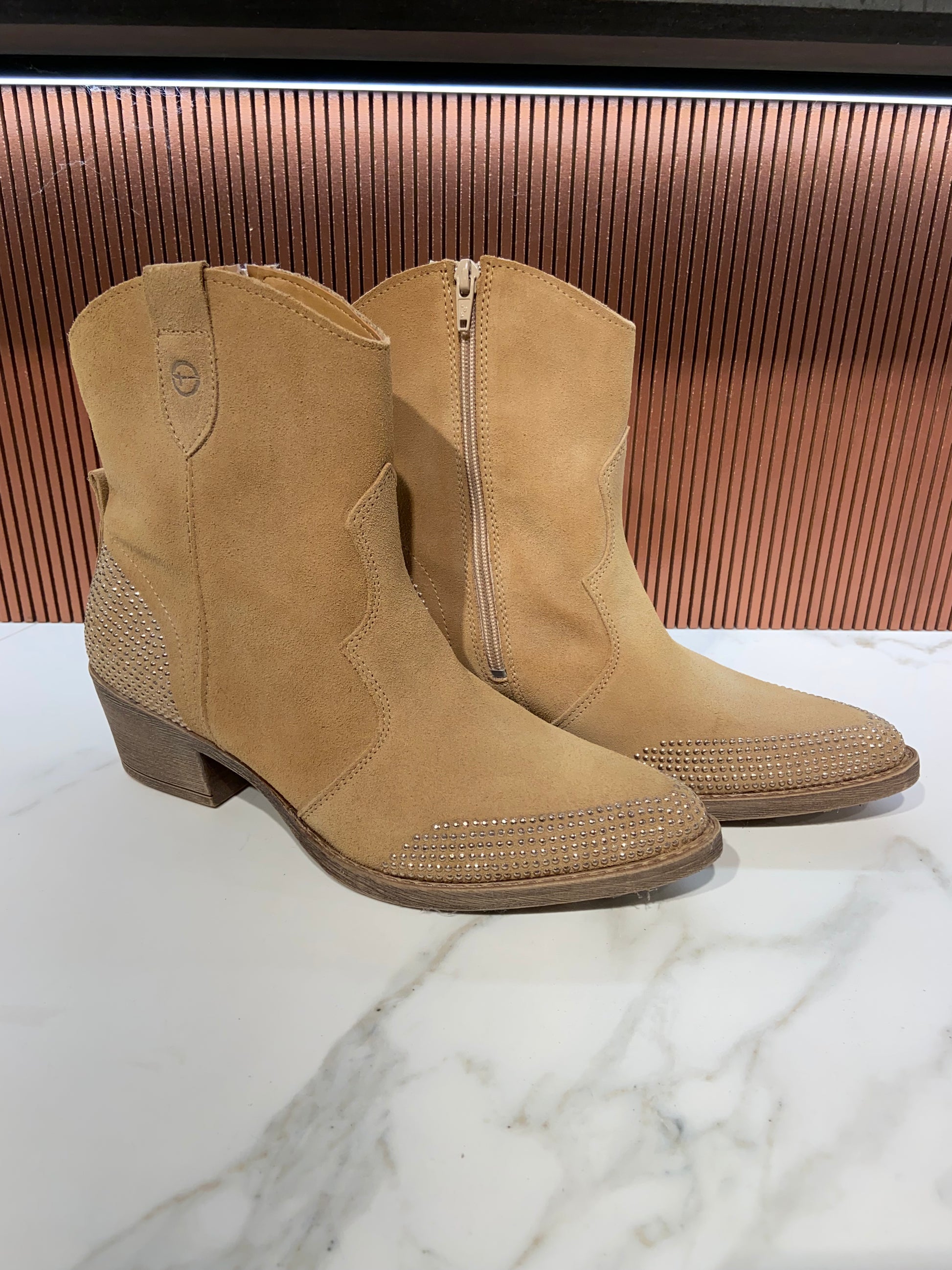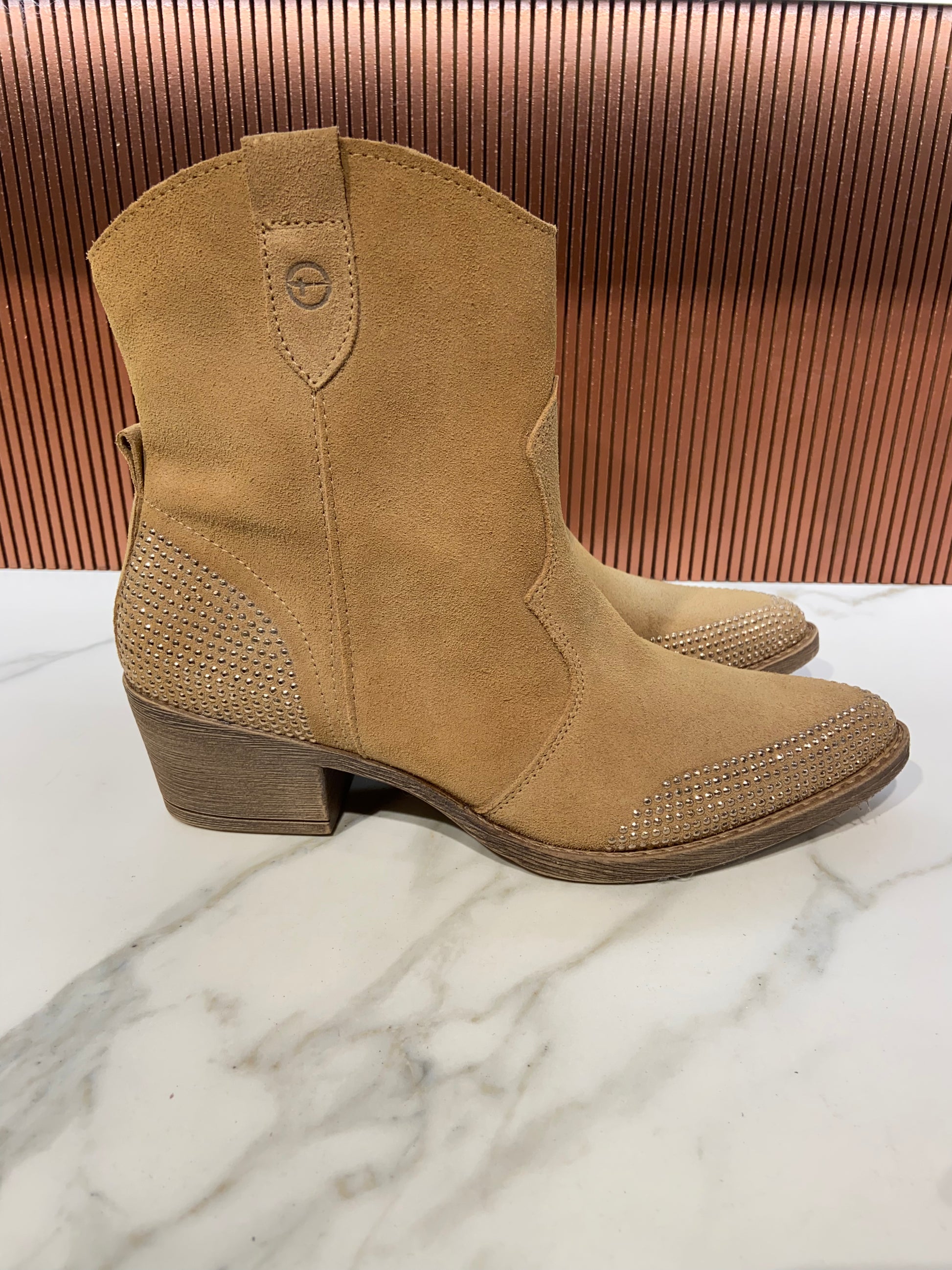 Bottines à strass type santiag en cuir beige.