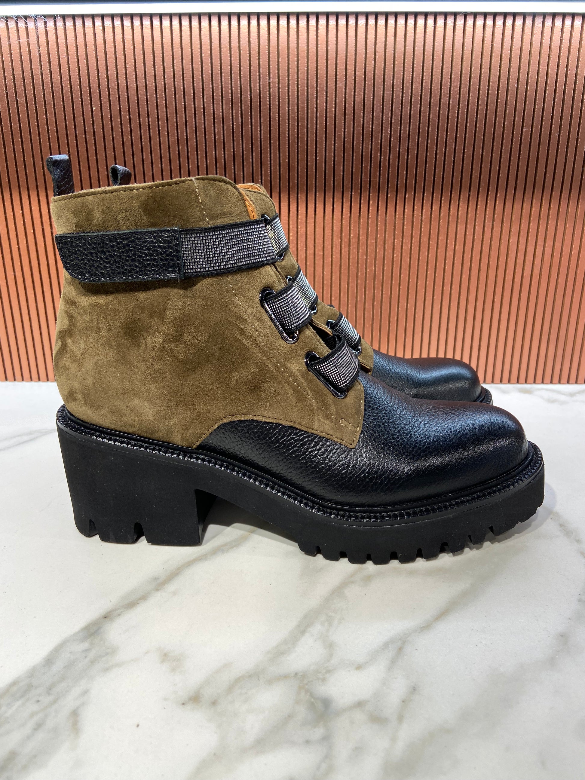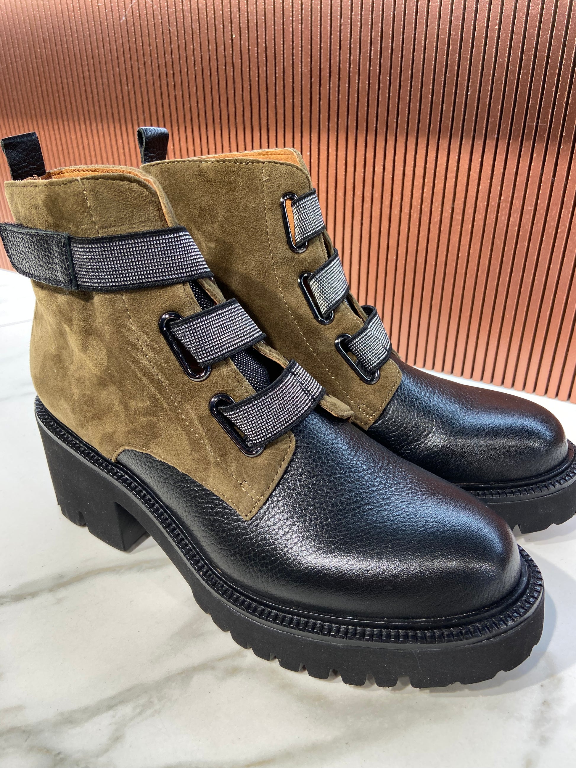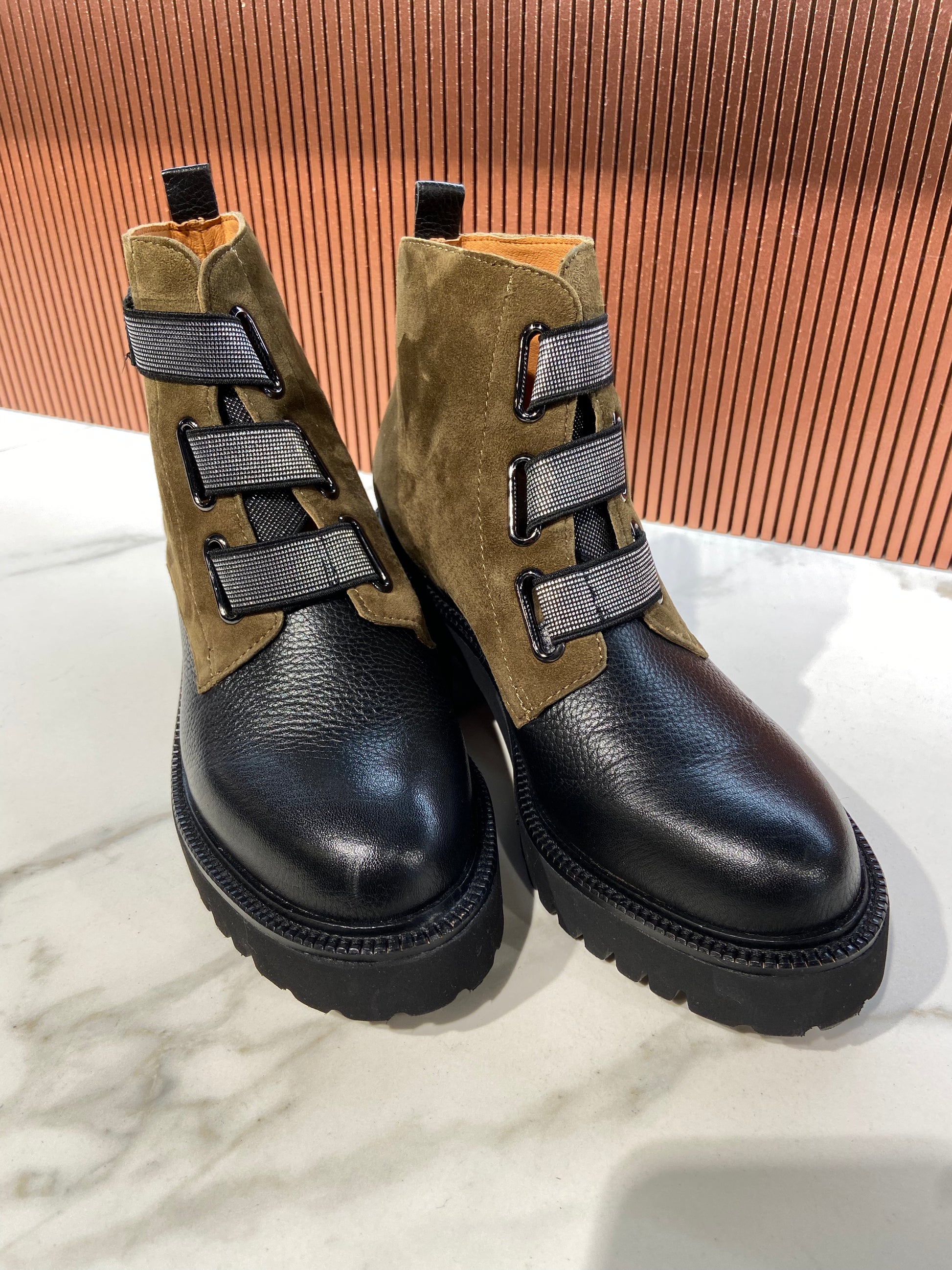 Bottines en cuir bicolore kaki et noir à scratch.