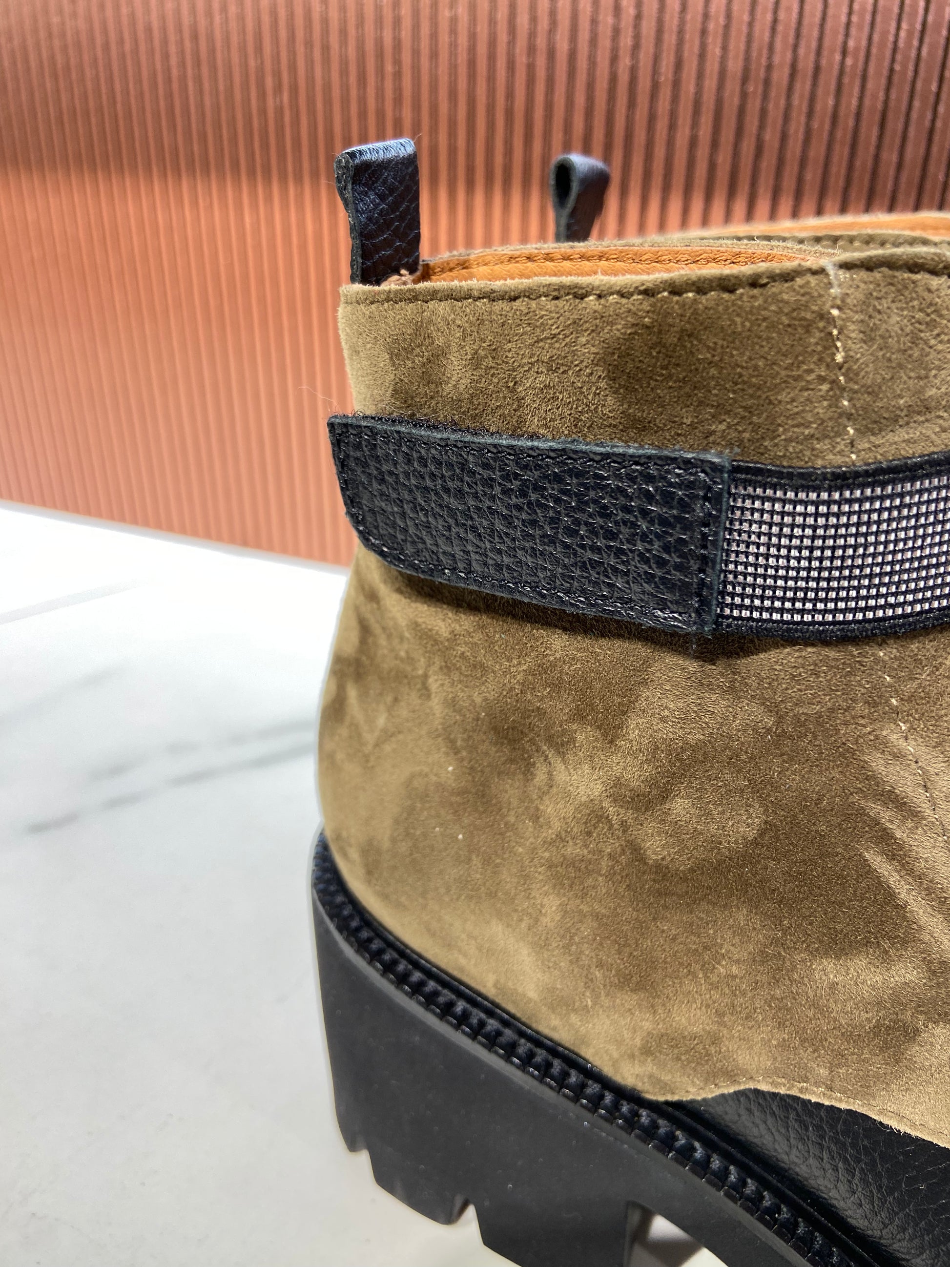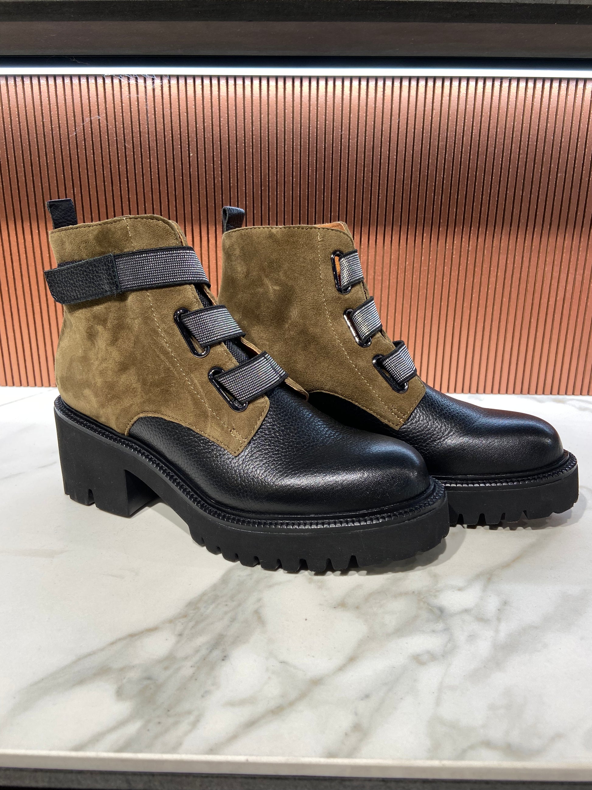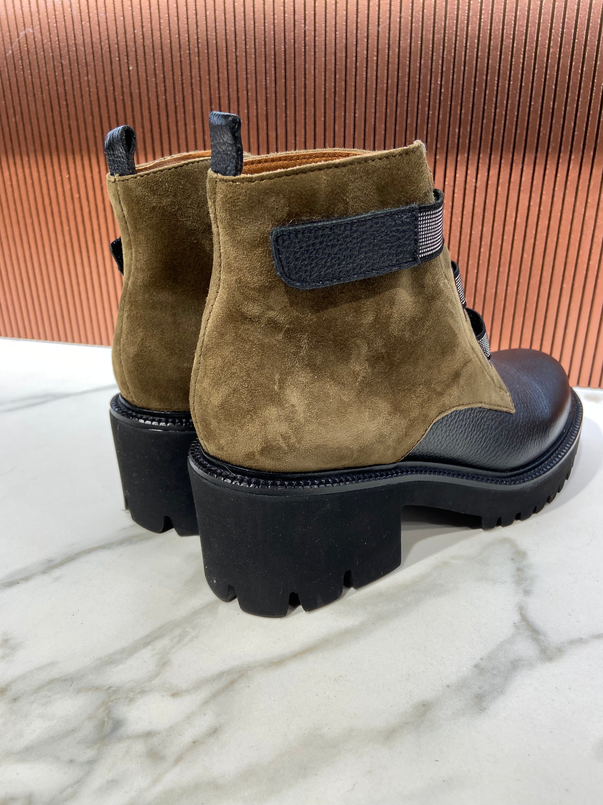 Bottines en cuir bicolore kaki et noir à scratch.