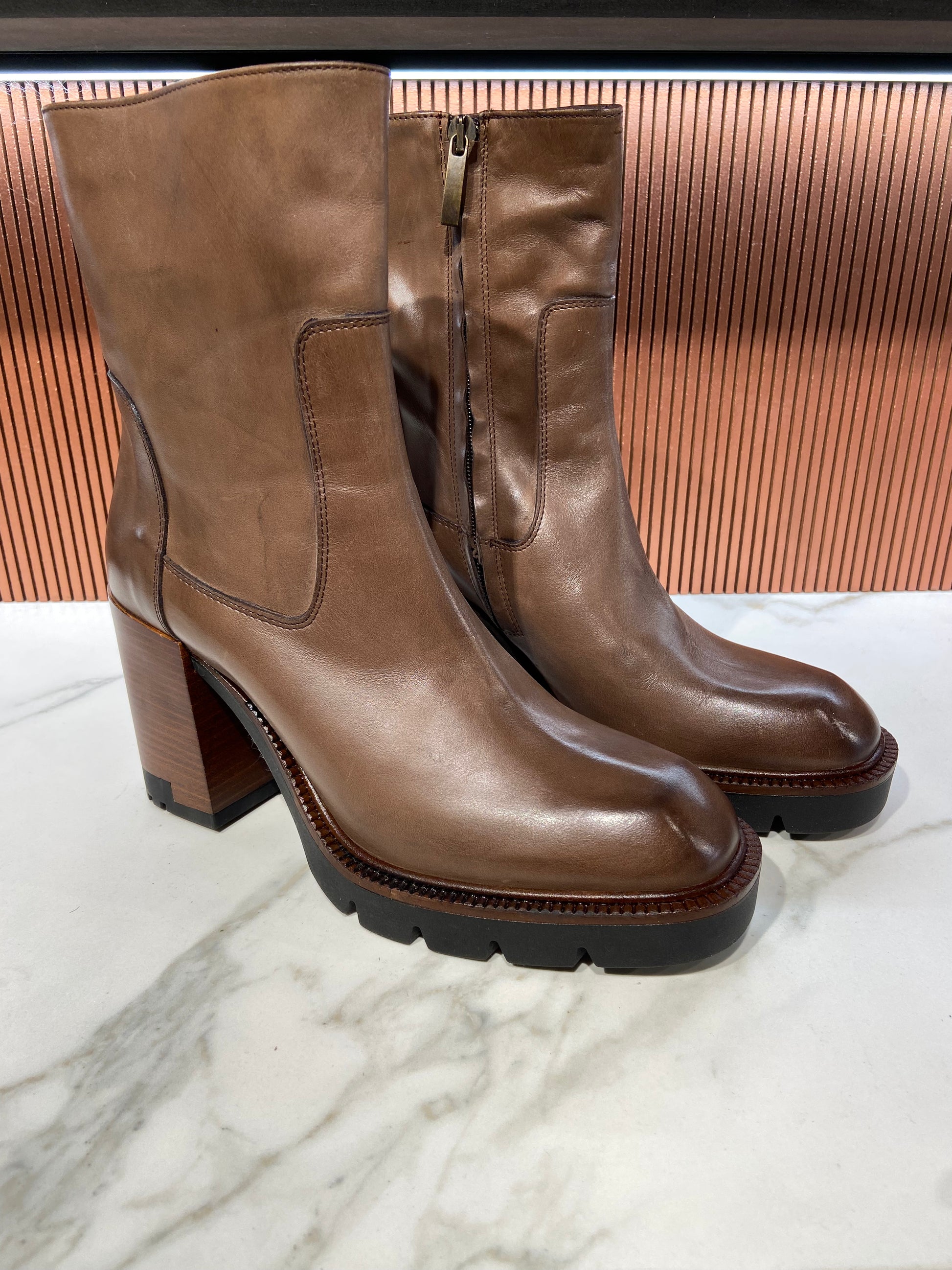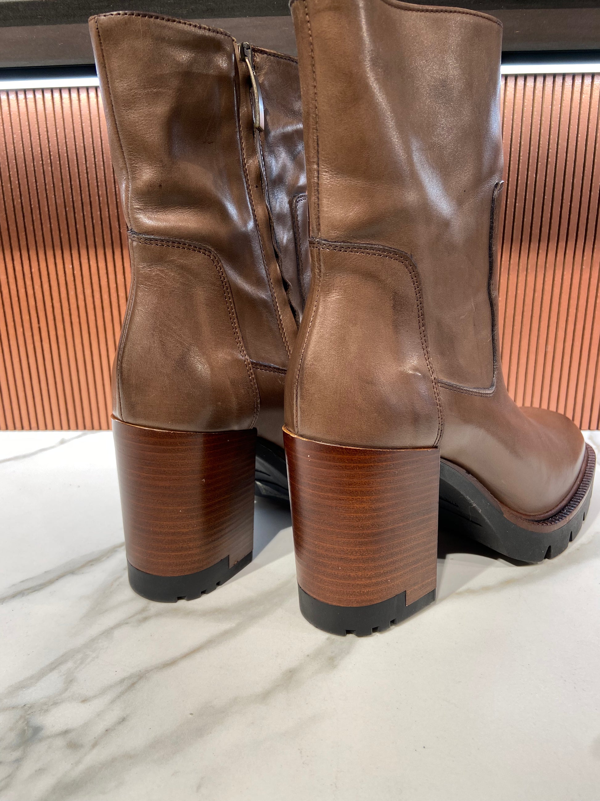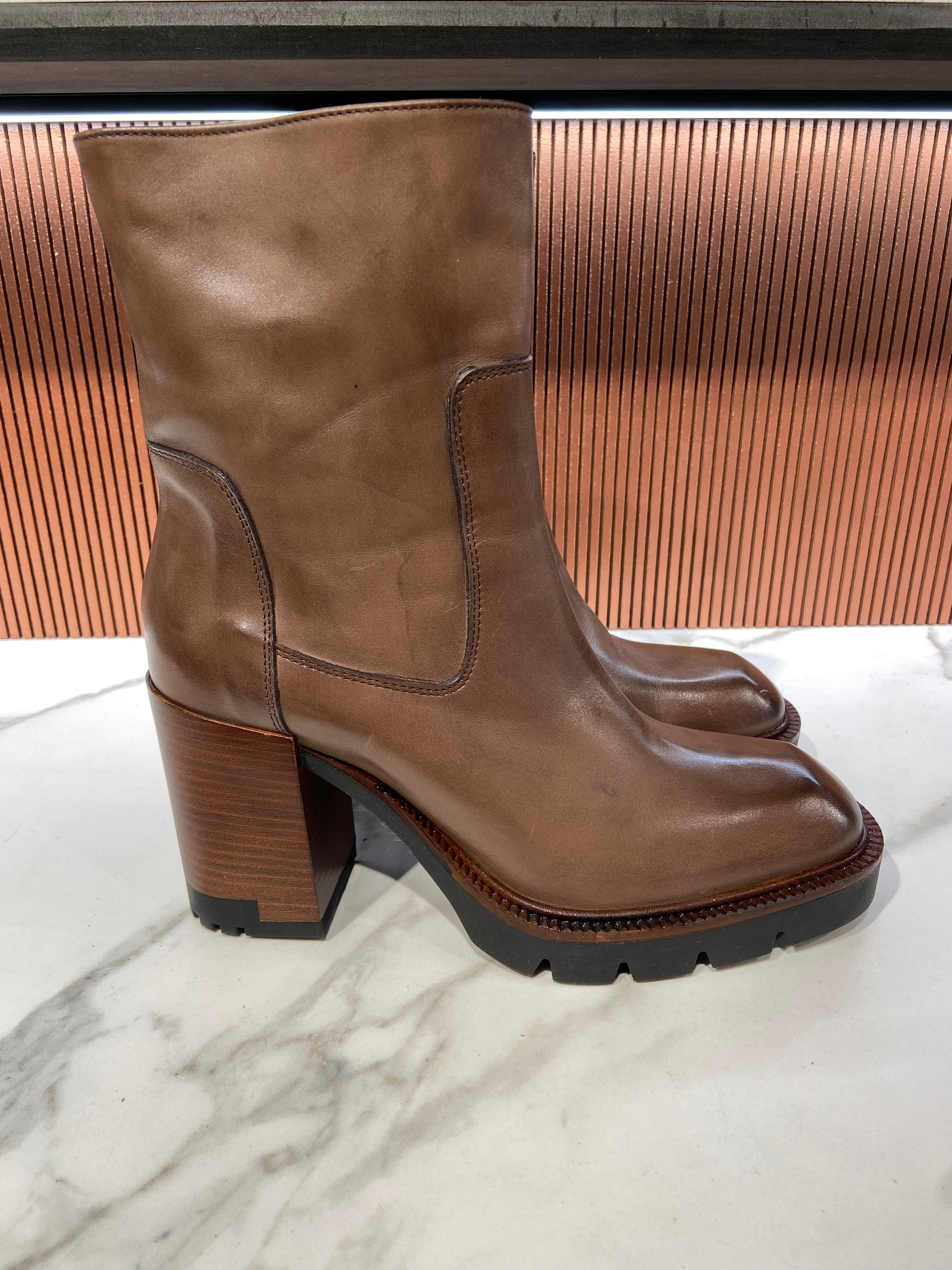 Bottines à talon en cuir marron glacé.