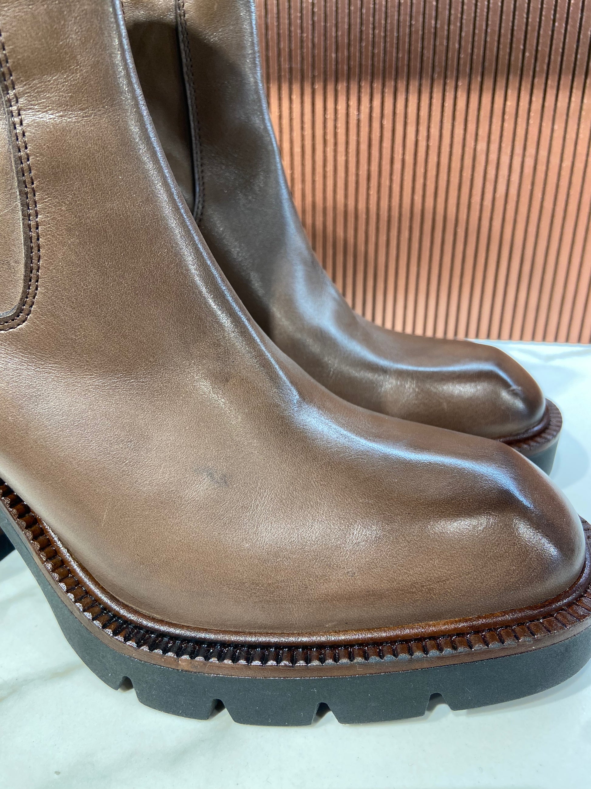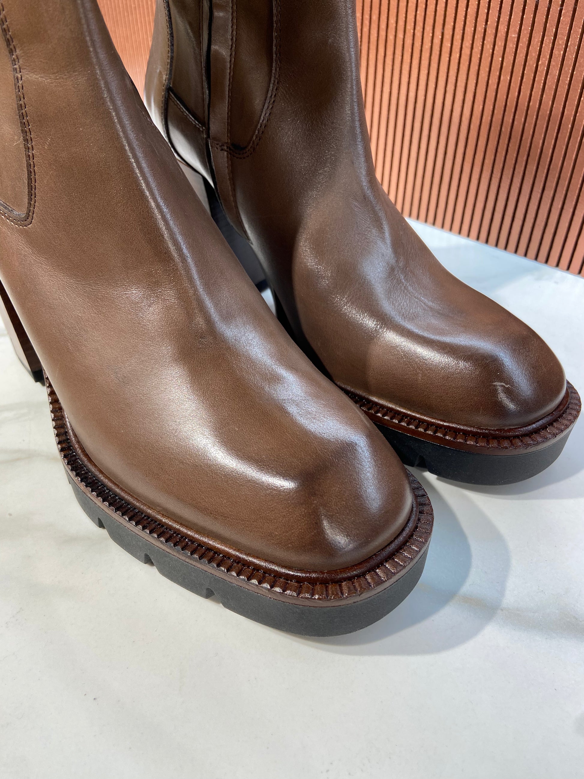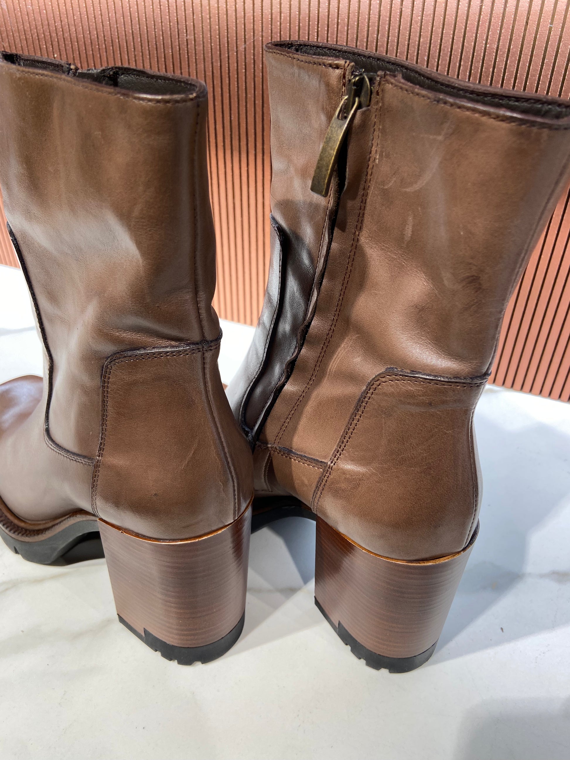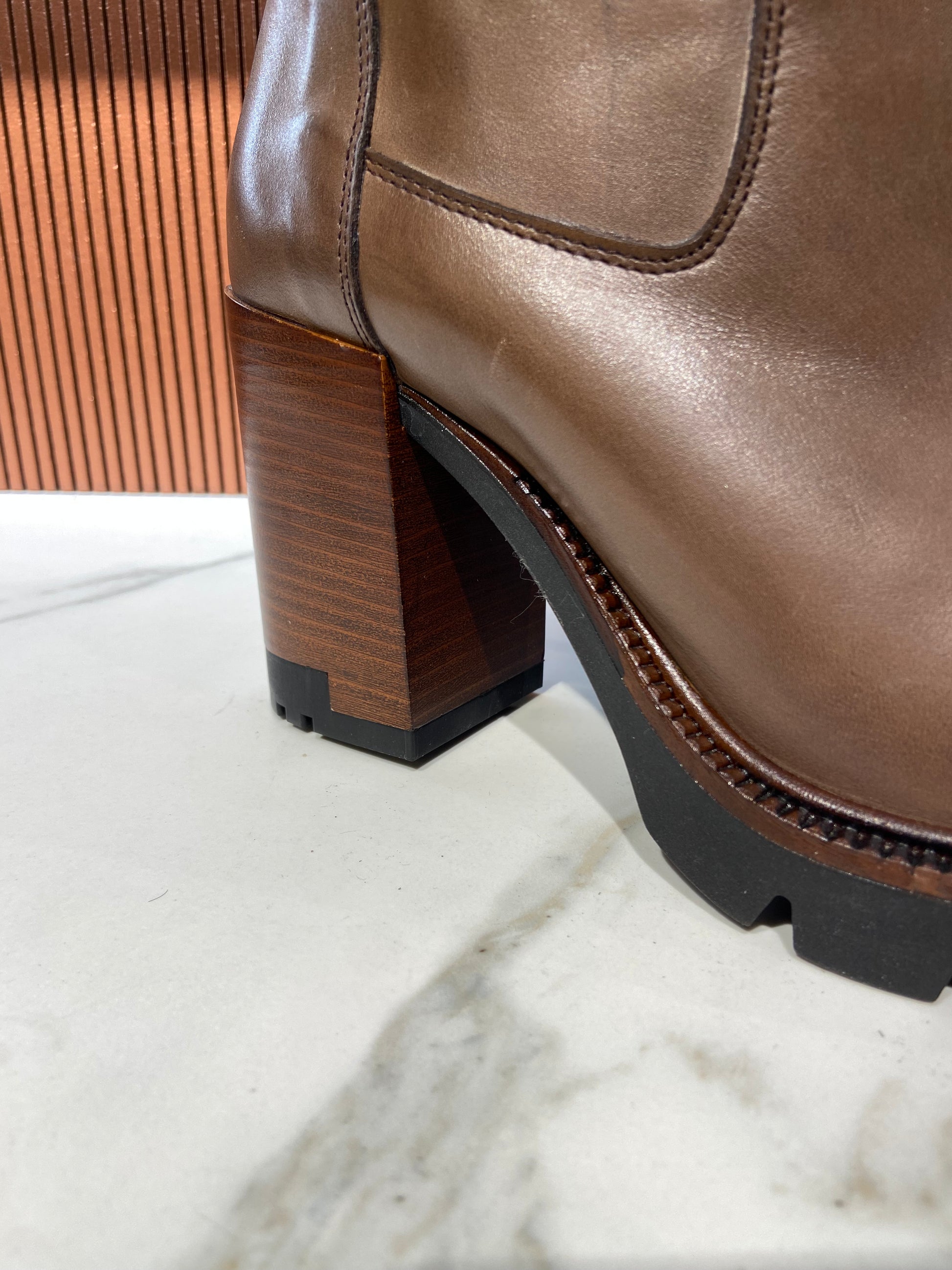 Bottines à talon en cuir marron glacé.