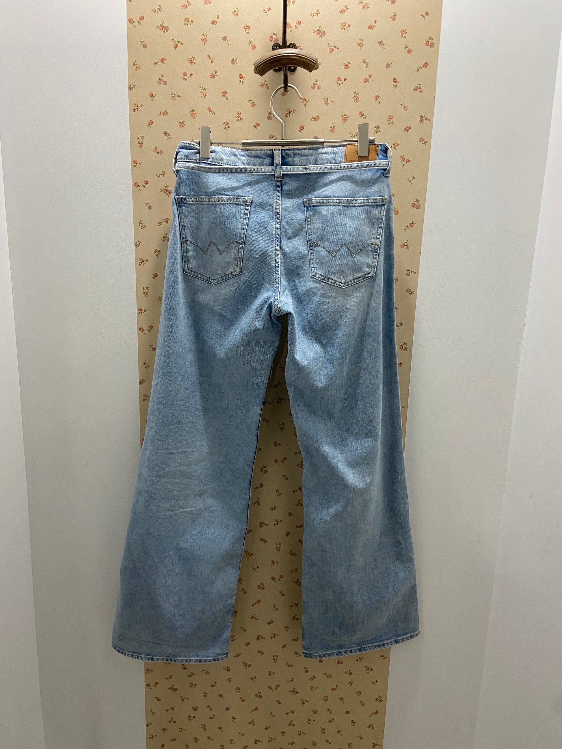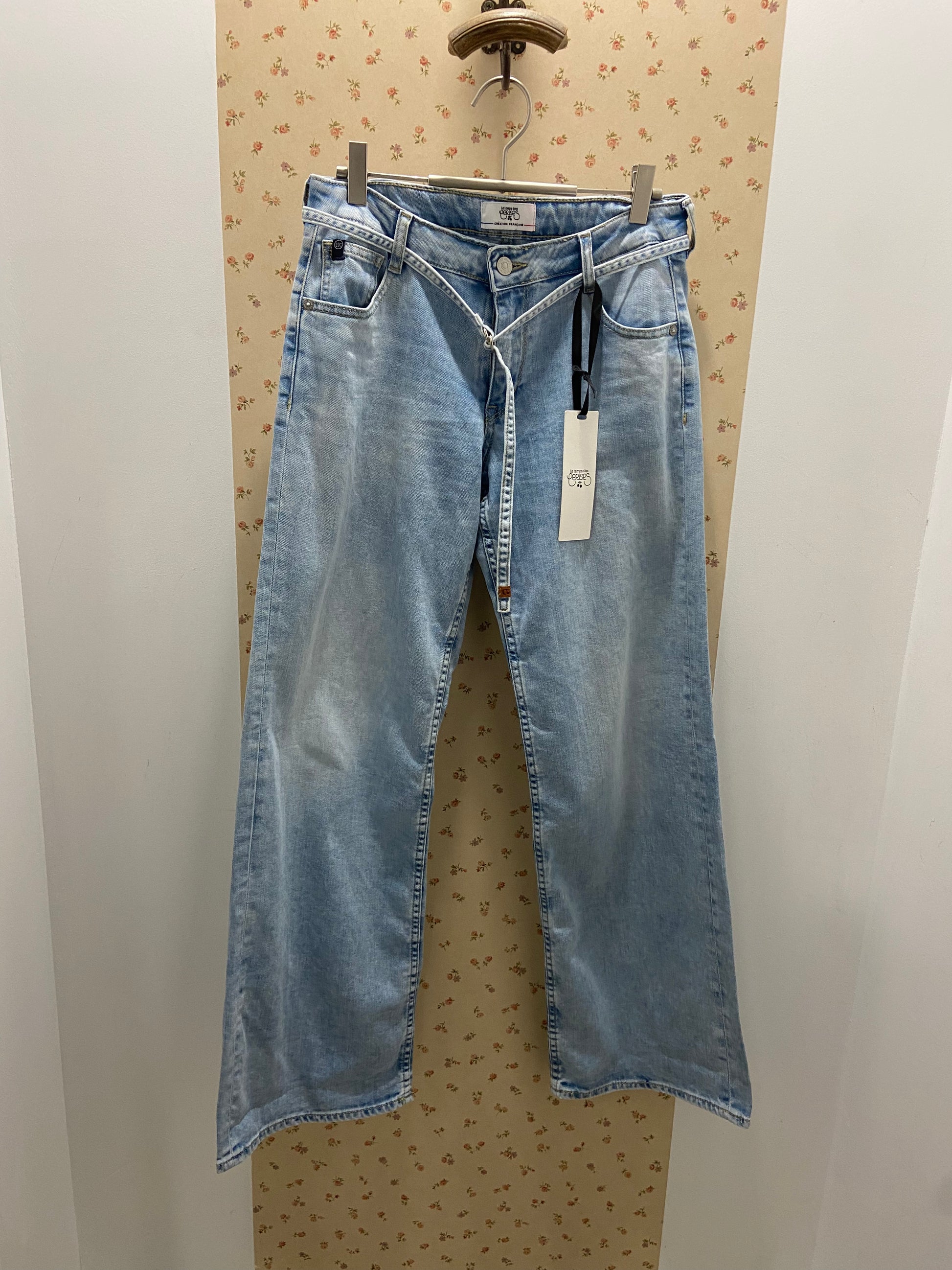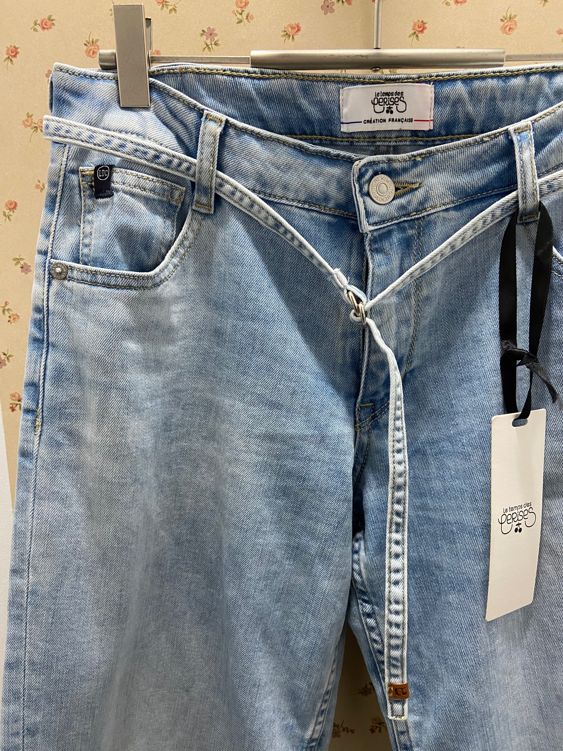 Jeans coupe wide taille basse, il a une petite ceinture réglable.