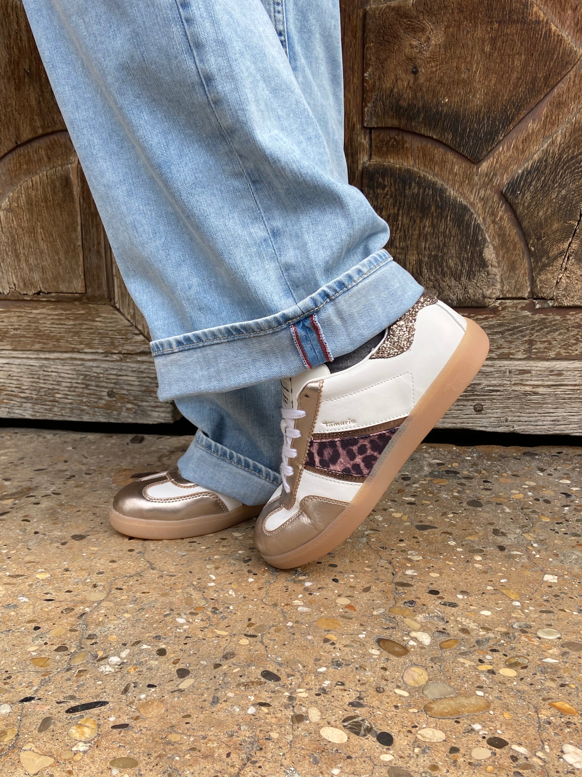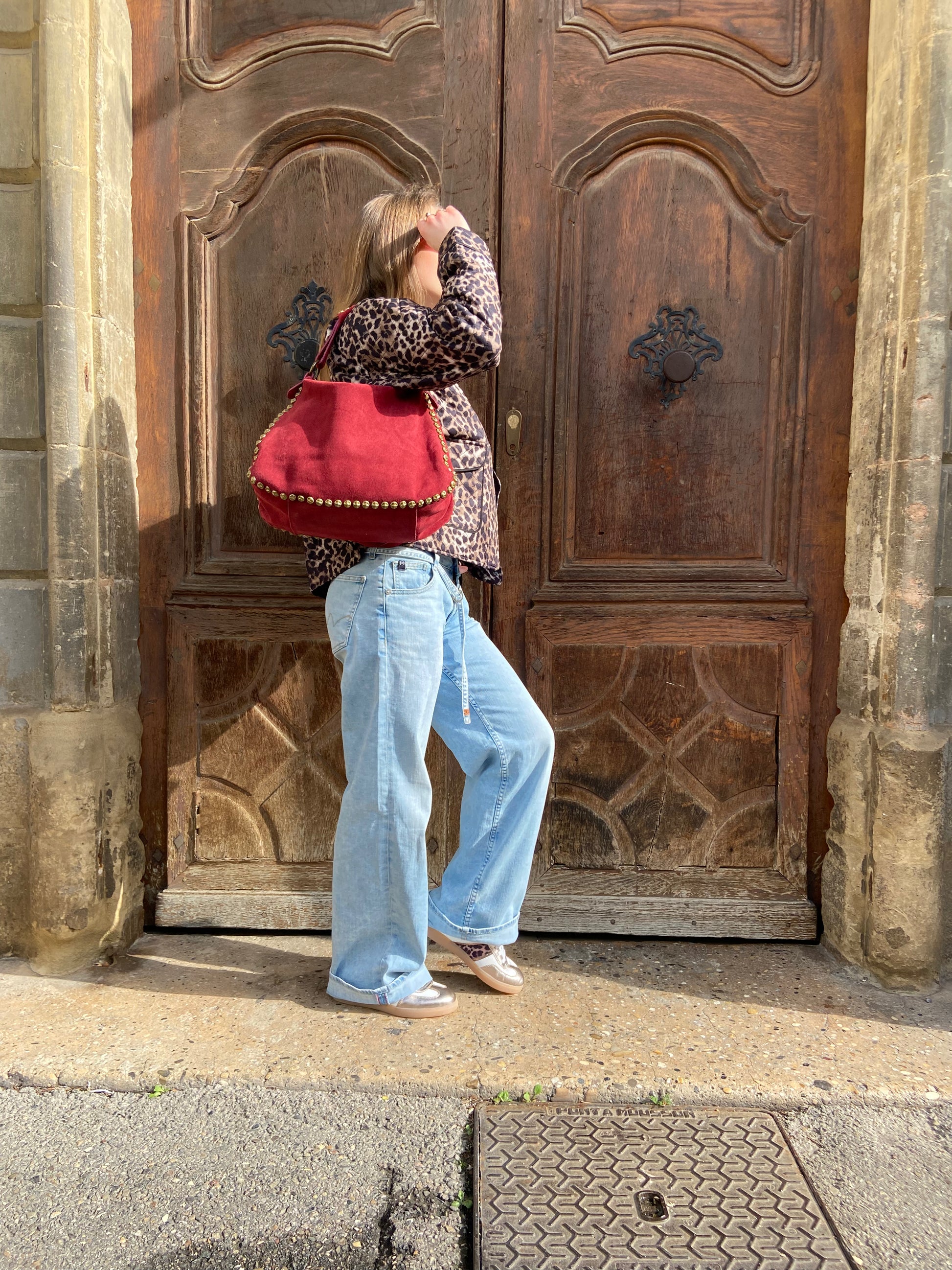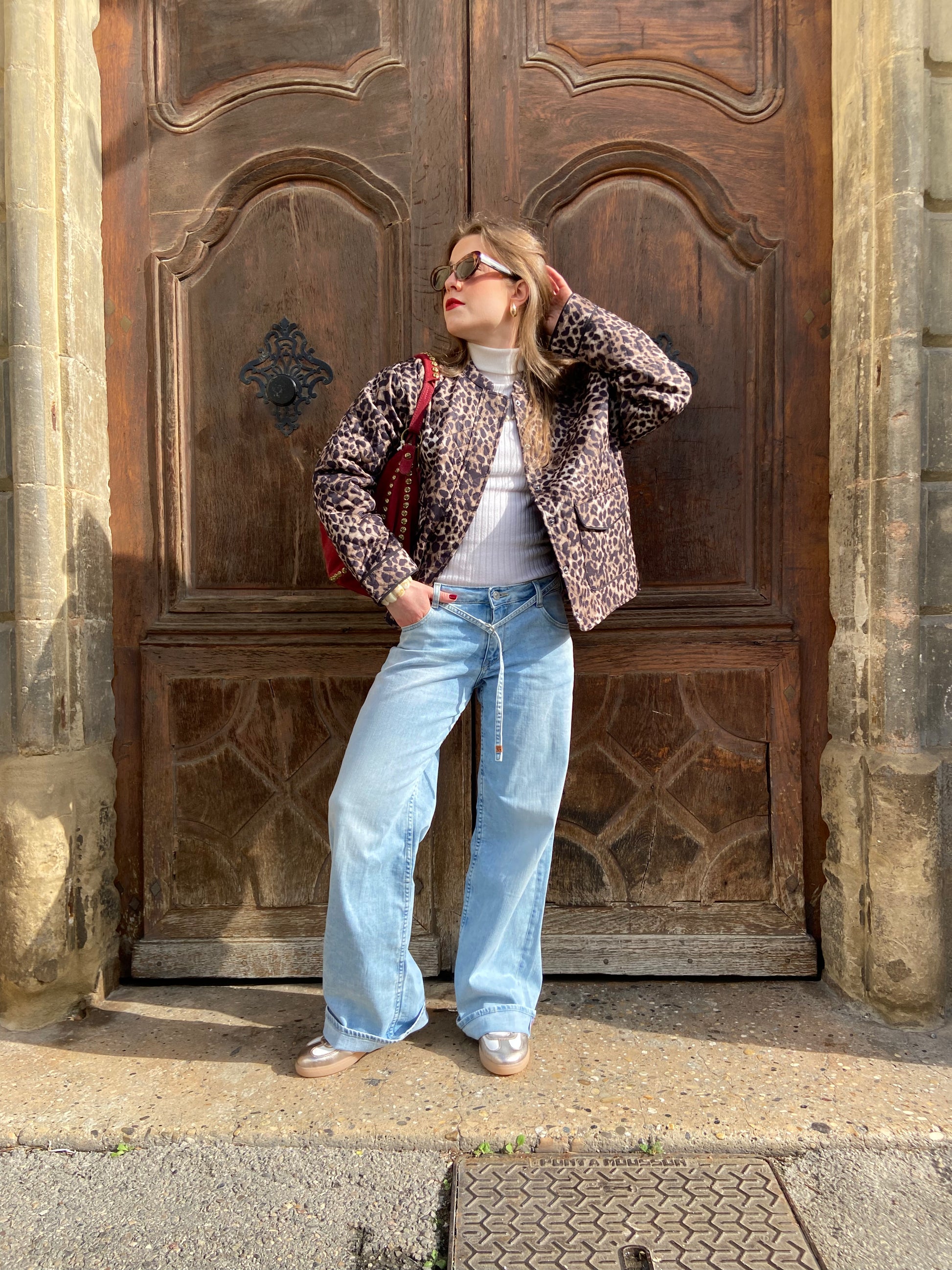 Jeans coupe wide taille basse, il a une petite ceinture réglable.