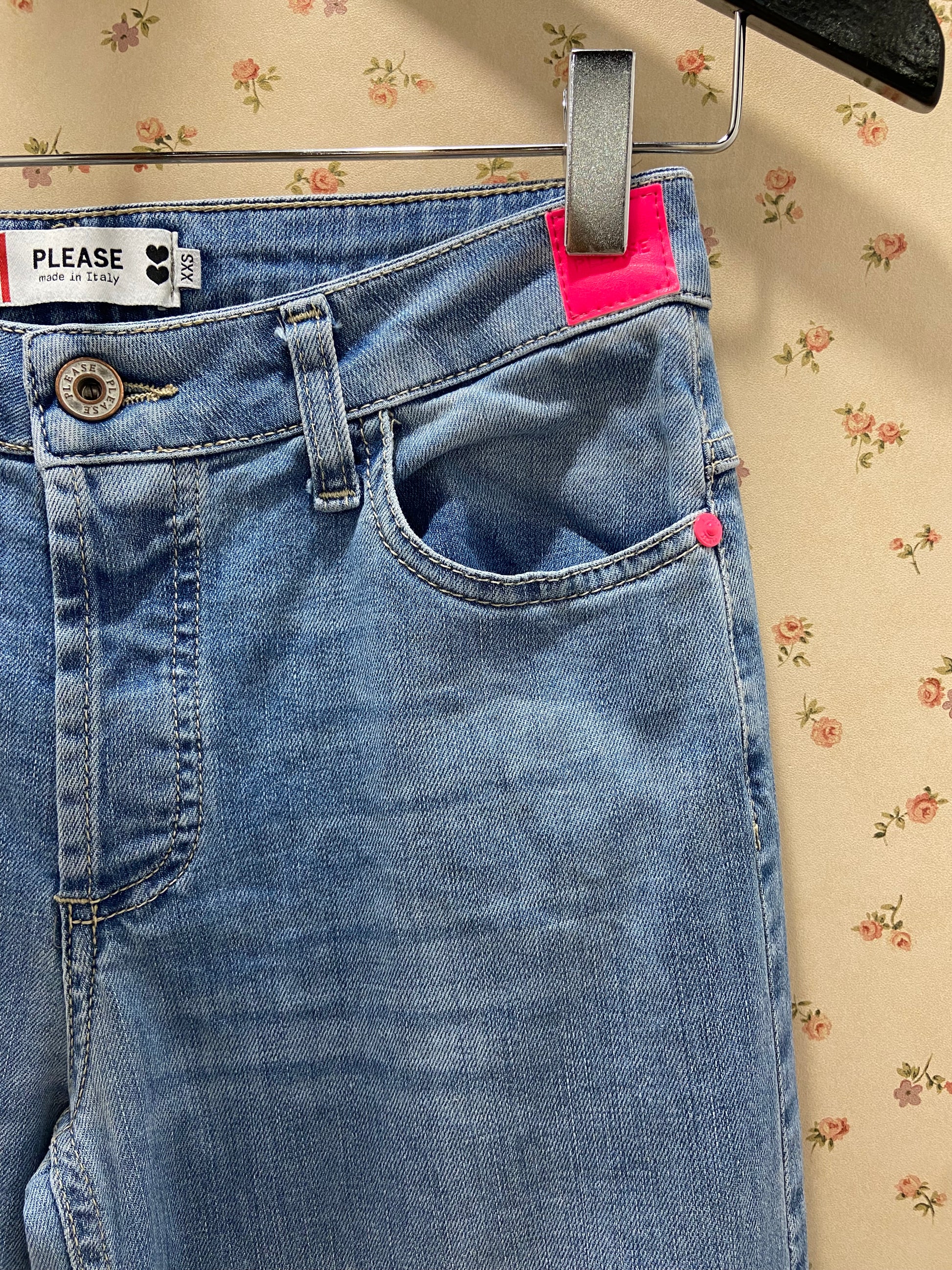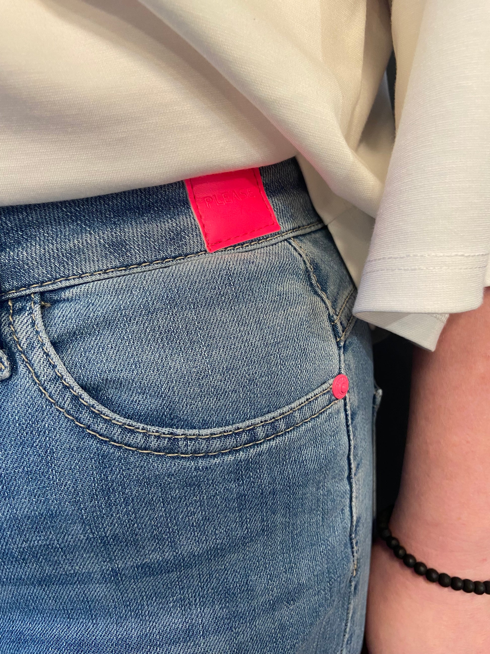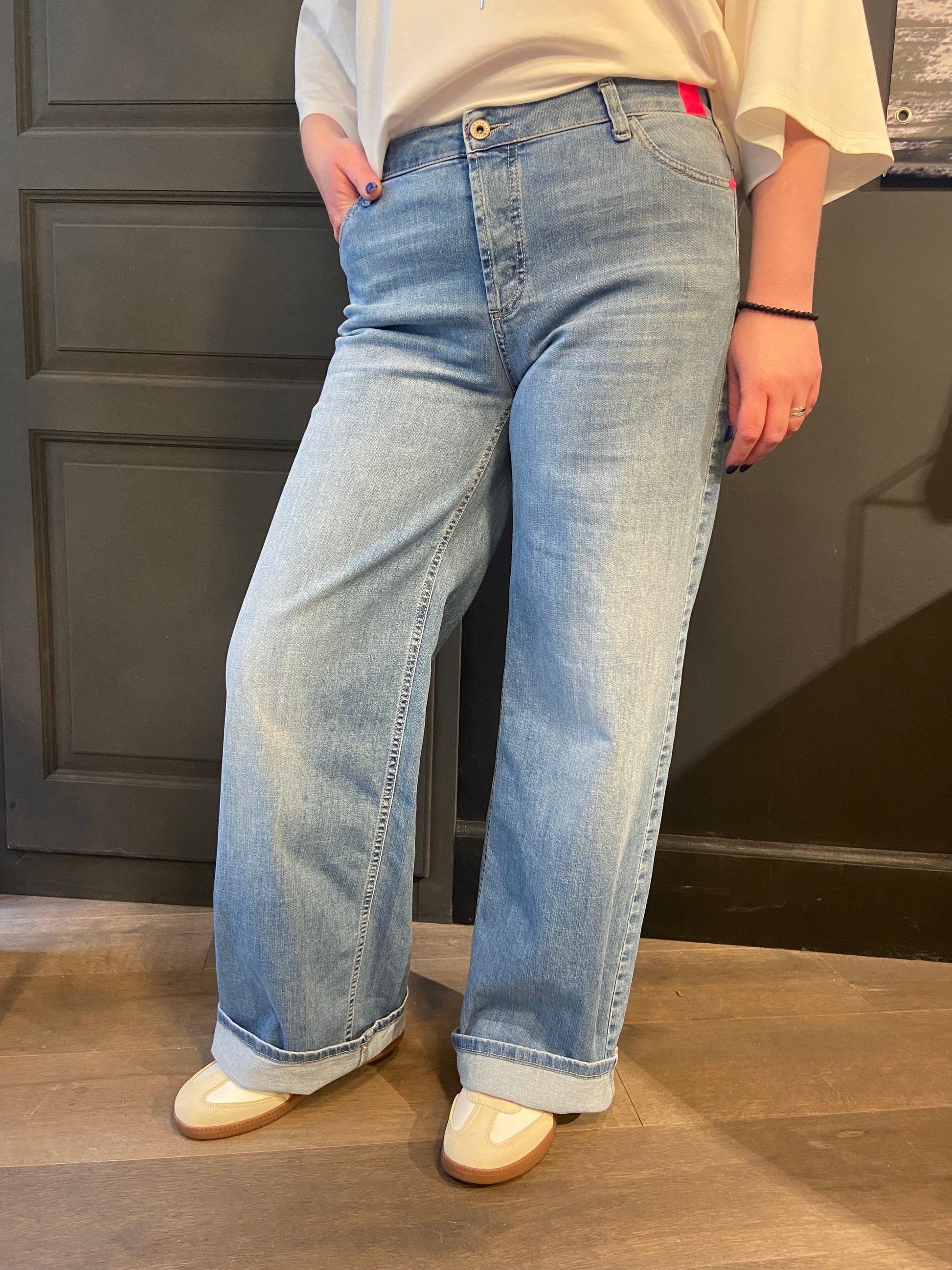Jeans coupe wide 7/8ème avec finitions rose fluo.