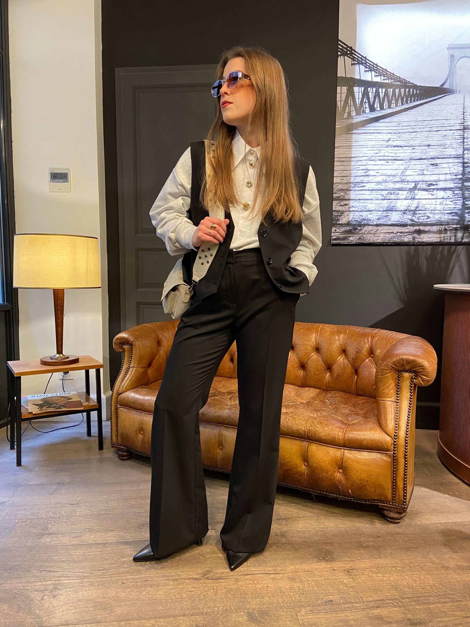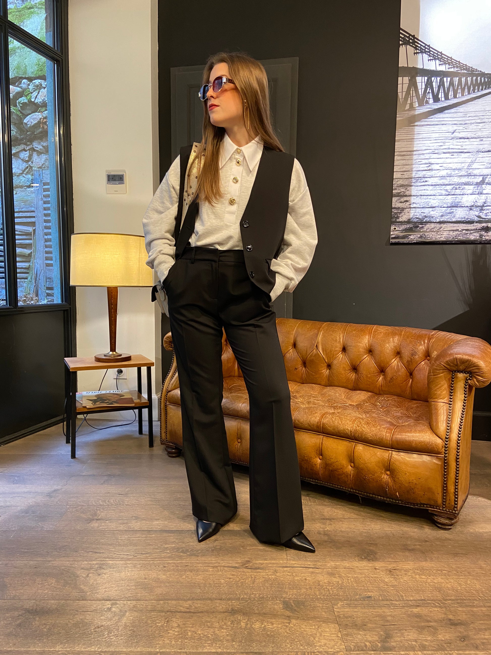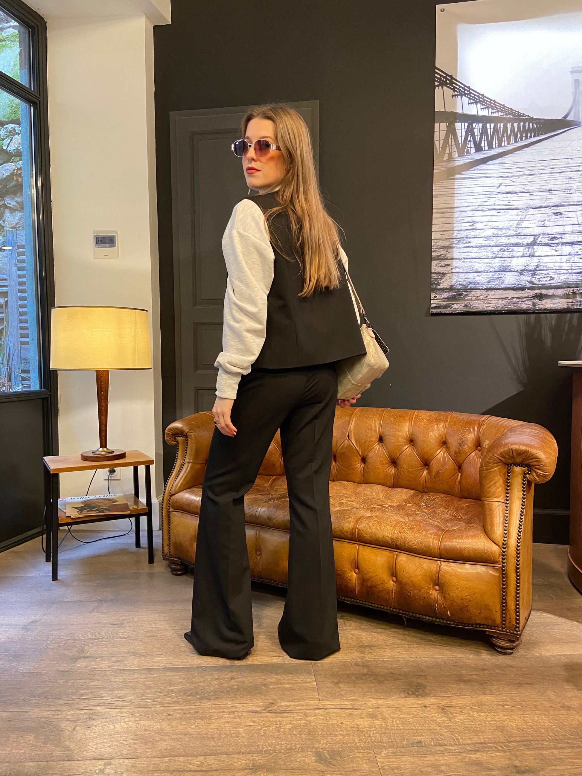 Pantalon coupe flare de costume, il est monté avec un bouton et une fermeture à glissière et possède une matière assez fluide et légère.