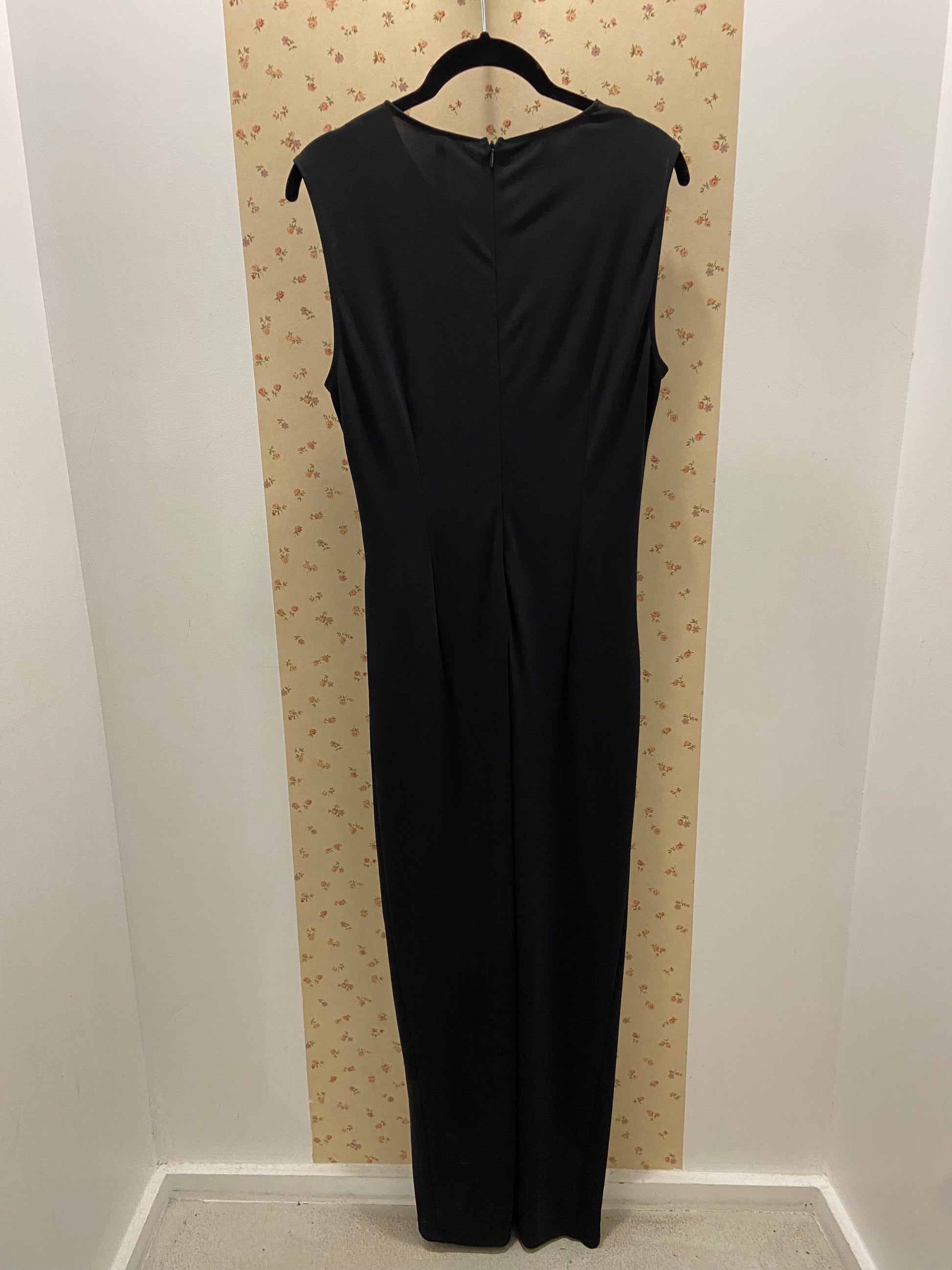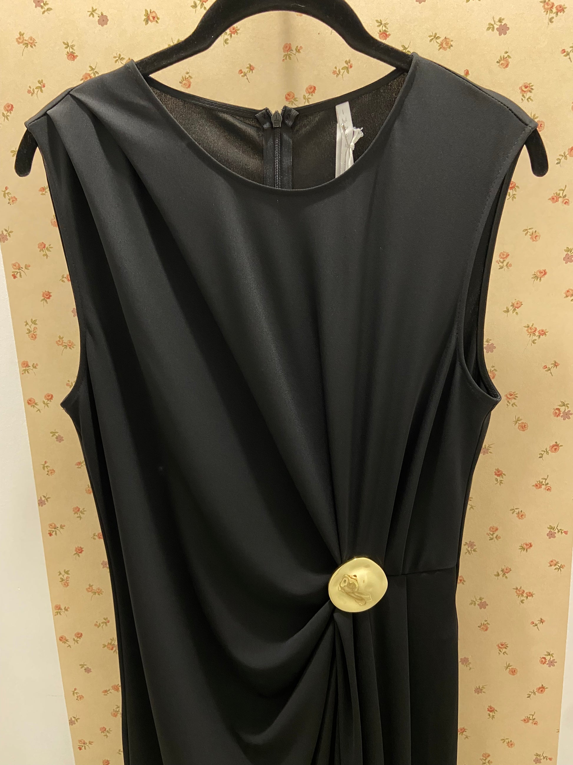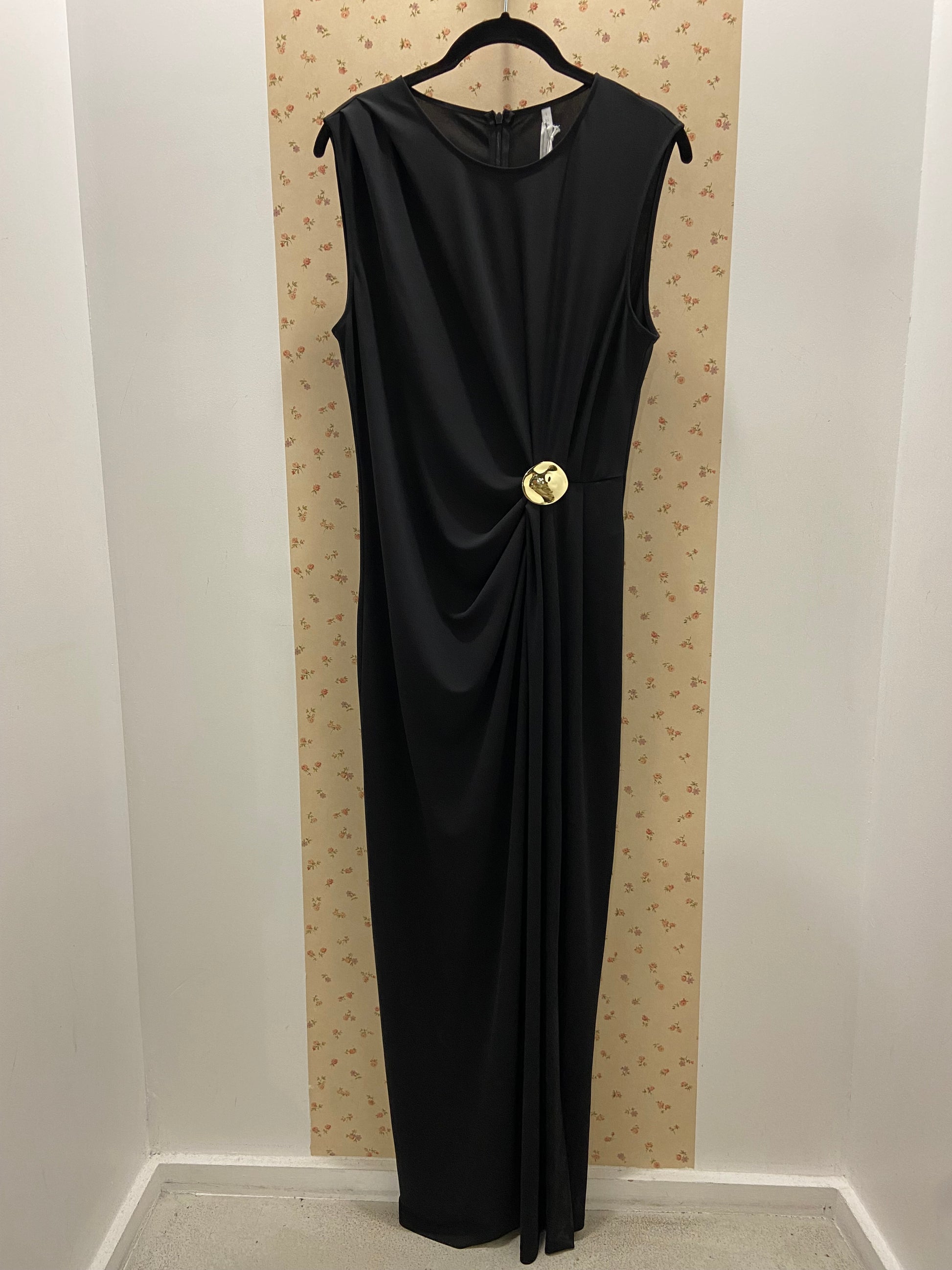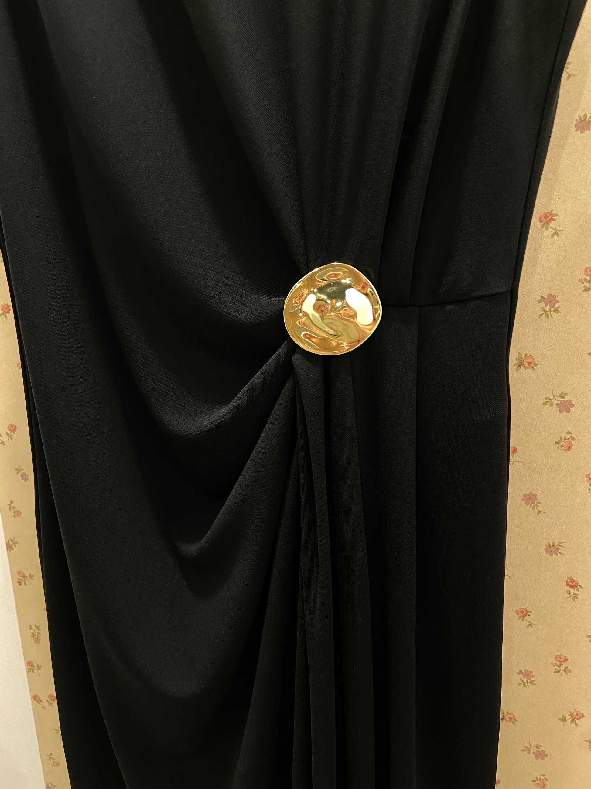 Robe longue fluide ajustée, le bijoux est une broche qui peut se retirer. Elle se ferme avec un zip au dos.